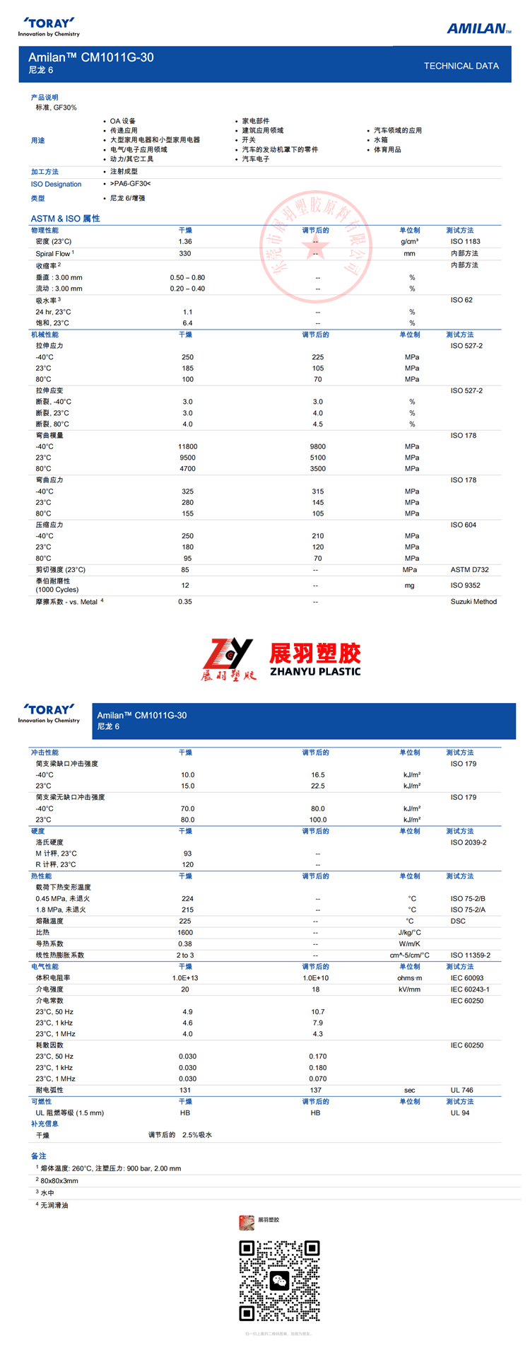>PA6-GF30< 阻燃等級(jí): HB 缺口沖擊: 10.0 kJ/m2 熱變形溫度: 224 °C 符合規(guī)定: UL