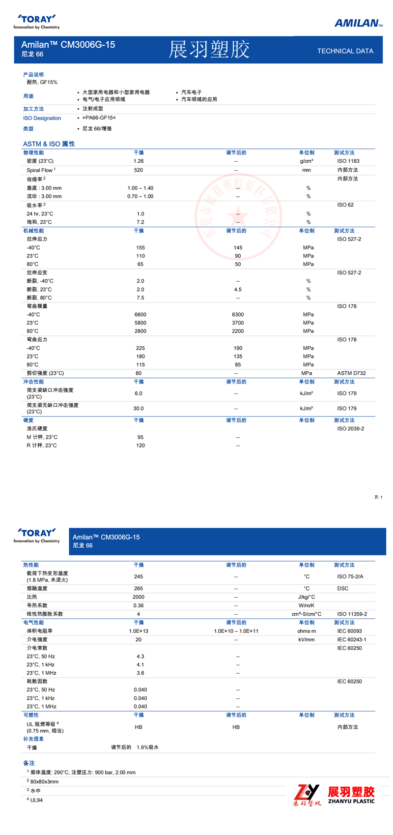 東麗 Amilan CM3006G-15(PA66-GF15 )耐熱級(jí) 聚酰胺66 玻璃纖維15%材料