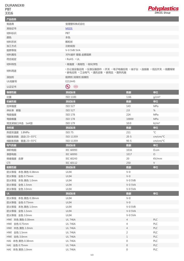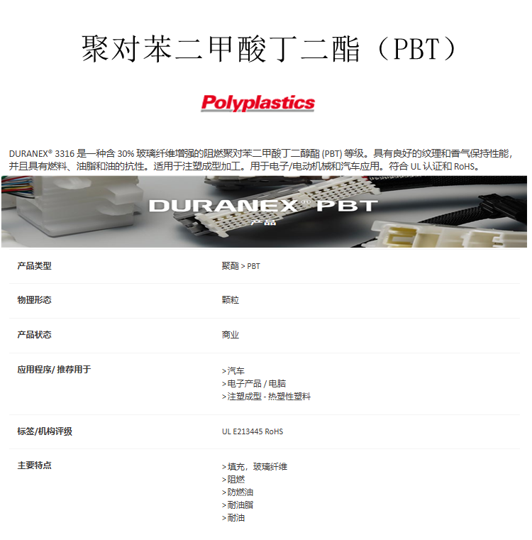 寶理 DURANEX® PBT 3316 阻燃V-0 玻纖增強(qiáng)GF30 高強(qiáng)度 高剛性 耐化學(xué)性