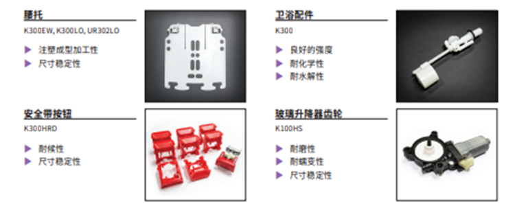 KOCETAL®是一種聚縮醛共聚物結(jié)晶度高的工程塑料。其代表性的特性是具有均衡的機(jī)械性能、低摩擦系數(shù)、優(yōu)秀的耐磨性、優(yōu)秀的耐燃料性的材料,吸濕率較低,具有穩(wěn)定的尺寸穩(wěn)定性。主要應(yīng)用范圍不僅有齒輪、燃油泵模塊、門鎖、車窗調(diào)節(jié)器部件、安全帶部件的車載部件,還可使用于冰箱、空調(diào)、打印機(jī)等家用電器驅(qū)動部件,以及扣環(huán)、拉鏈等日常生活用品等領(lǐng)域,可廣泛應(yīng)用。