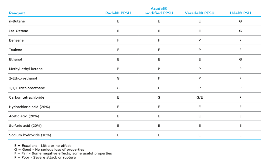 砜類聚合物對(duì)許多物質(zhì)具有良好的耐化學(xué)性,包括水體系、腐蝕劑、無(wú)機(jī)酸、脂肪族烴、洗滌劑和肥皂以及某些醇。